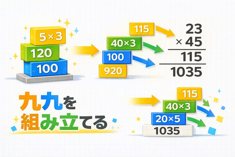 九九の「次」を作る学年 2年生でかけ算九九を完成させた子どもたちは、3年生で 23×4、23×45 といった九九を超えた計算に出会う。 新しい九九を覚えるのではない。既知の九九を組み立てて、より大きな計算を作る——これが3年生のかけ算の筆算の本質だ。 ここ... -