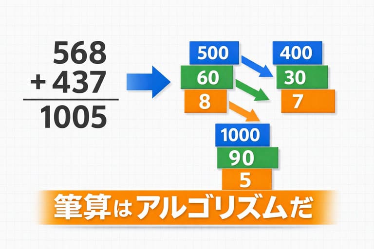 筆算は「アルゴリズム」だ 568 + 437 を暗算でやろうとすると、大人でも迷う。しかし紙に縦に並べて書けば、誰でも同じ手順で答えにたどり着ける。 これが筆算だ。筆算は位ごとに計算するというアルゴリズムの実装であり、十進位取り記数法の最大のメリッ... -